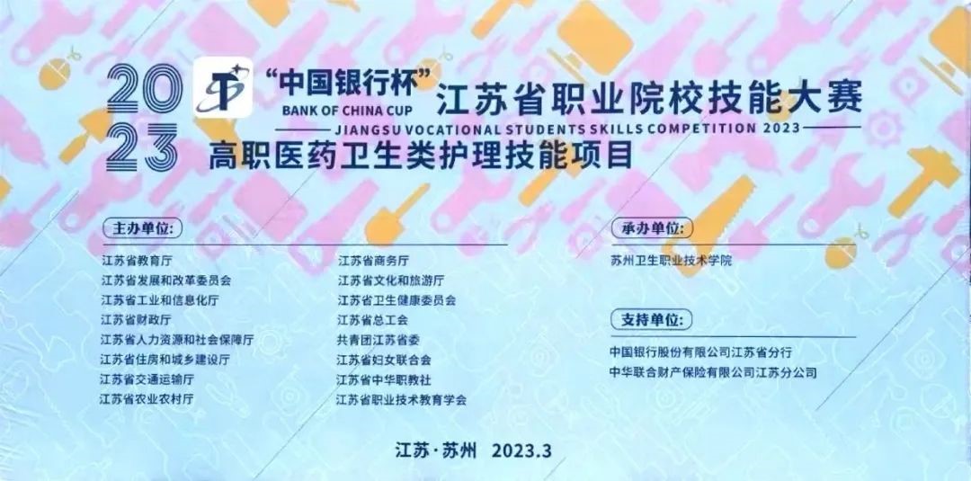 由江苏省教育厅、江苏省发改委等16个部门共同主办,苏州卫生职业技术学院承办,2023年“中国银行杯”江苏省职业院校技能大赛高职医药卫生类护理技能项目于3月5日顺利闭幕!技能大赛的成功举办对于推进新时代职业教育服务技能型社会发挥了积极作用。